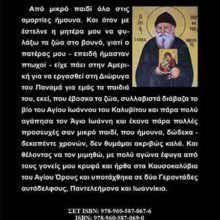 Από μικρό παιδί όλο στις αμαρτίες ήμουνα. Και όταν με έστελνε η μητέρα μου να φυλάξω τα ζώα στο βουνό, γιατί ο πατέρας μου – επειδή ήμασταν πτωχοί – είχε πάει στην Αμερική για να εργασθεί στη Διώρυγα του Παναμά για εμάς τα παιδιά του, εκεί, που έβοσκα τα ζώα, συλλαβιστά διάβαζα το βίο του Αγίου Ιωάννου του Καλυβίτου και πάρα πολύ αγάπησα τον Άγιο Ιωάννη και έκανα πάρα πολλές προσευχές σαν μικρό παιδί, που ήμουνα, δώδεκα – δεκαπέντε χρονών, δεν θυμάμαι ακριβώς καλά. Και θέλοντας να τον μιμηθώ, με πολύ αγώνα έφυγα από τους γονείς μου κρυφά και ήρθα στα Καυσοκαλύβια του Αγίου Όρους και υποτάχθηκα σε δύο Γεροντάδες αυτάδελφους, Παντελεήμονα και Ιωαννίκιο.